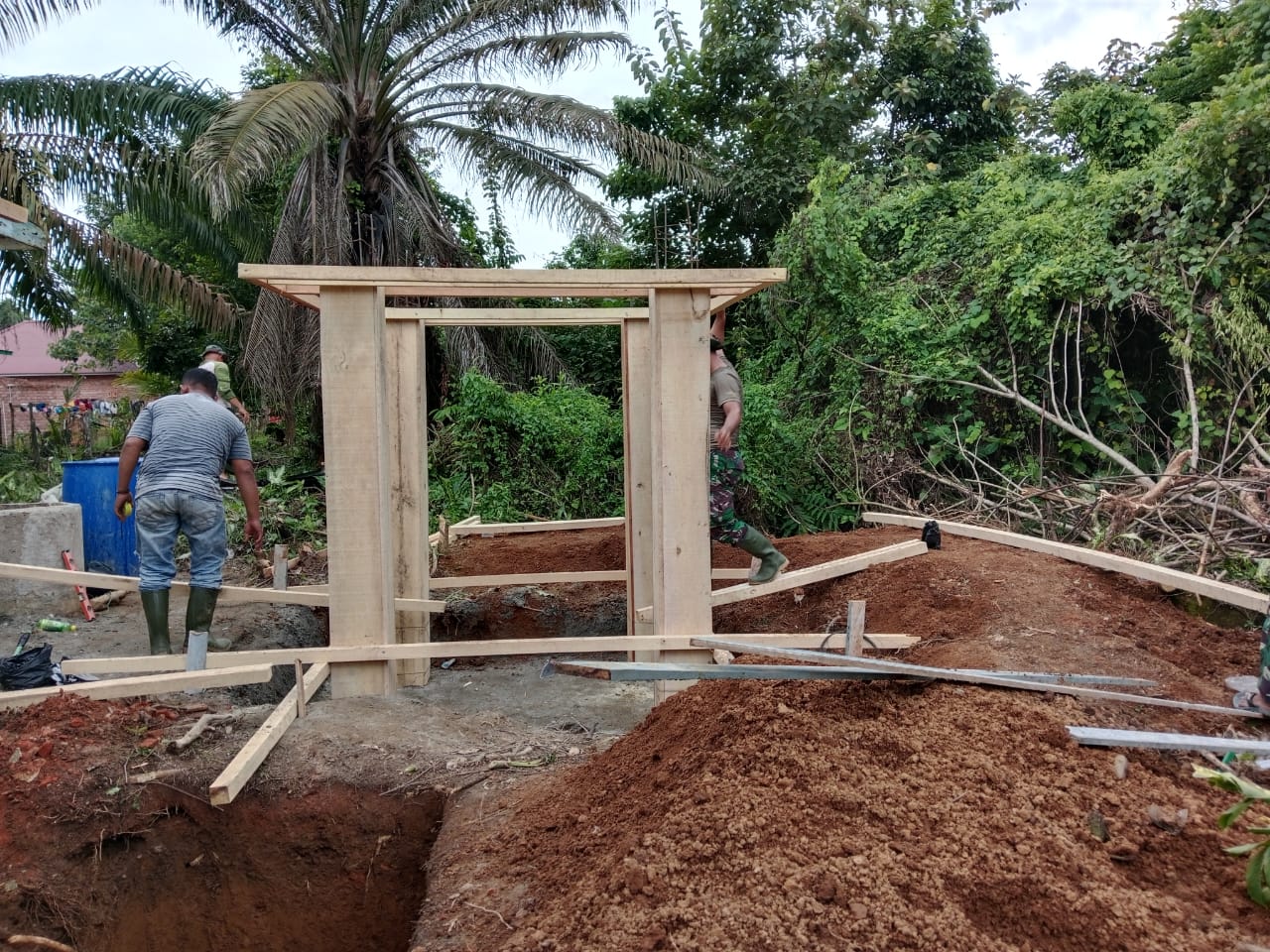 Tebo – Anggota Satuan Tugas (Satgas) TNI Manunggal Membangun Desa (TMMD) Ke-123 Kodim 0416/Bute memulai pembangunan tower air untuk fasilitas Mandi, Cuci, Kakus (MCK) di Madrasah Ibtidaiyah Nurul Falah, Desa Teluk Kuali, Kecamatan Tebo Ulu, Kabupaten Tebo, Jumat (21/02/2025).