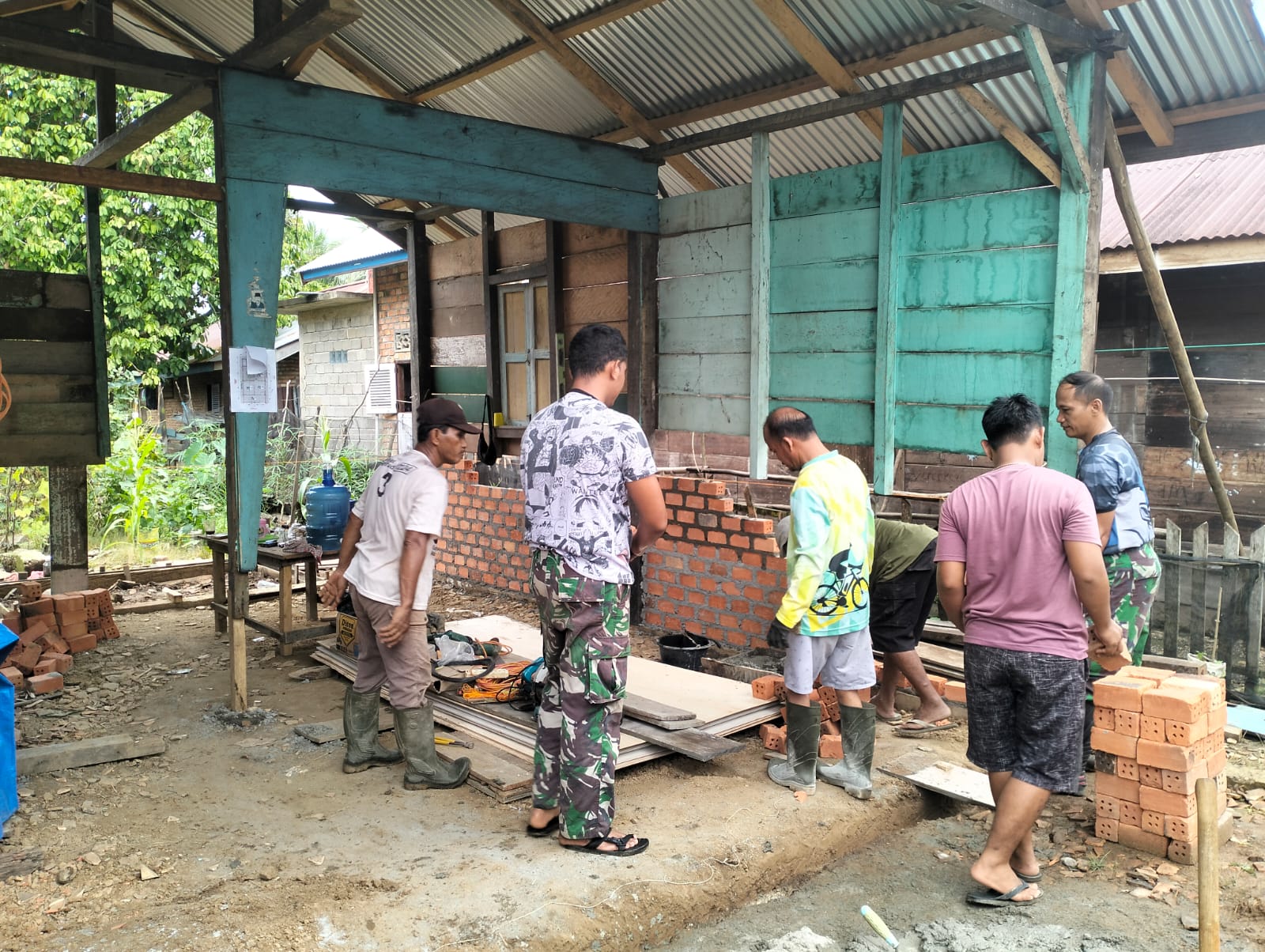 Anggota Satuan Tugas (Satgas) TNI Manunggal Membangun Desa (TMMD) Ke-123 Kodim 0416/Bungo Tebo (Bute) dan warga setempat terlihat tinggi saat mereka bahu-membahu menyelesaikan pengerjaan RTLH tersebut.