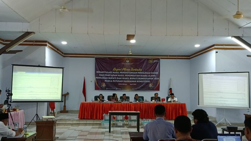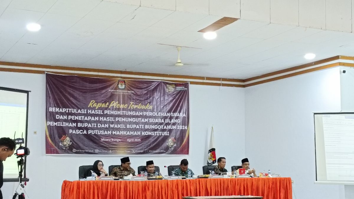 MUARABUNGO,BUNGOPOST.COM – Komisi Pemilihan Umum (KPU) Kabupaten Bungo menggelar Rapat Pleno Rekapitulasi Hasil Perhitungan Perolehan Suara dan Penetapan Hasil Pemungutan Suara Ulang Pasca Putusan Mahkamah Konsitusi (MK), Senin (7/4/2025).