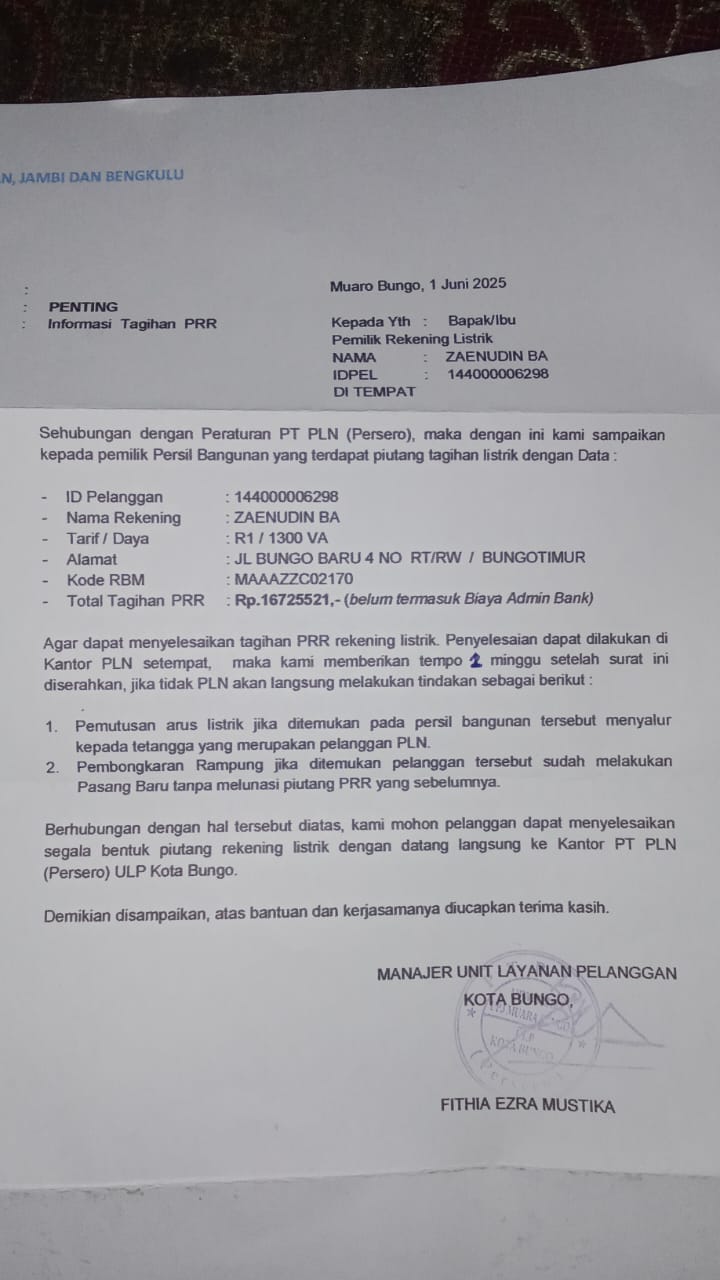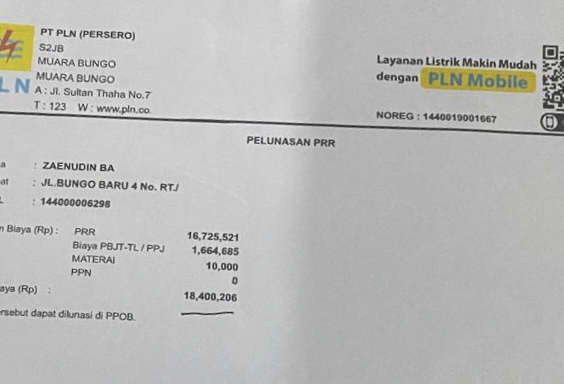 Pasalnya tagihan pemutusan PRR rekening listrik yang dilayangkan nama yang ditunjukan salah begitupun dengan alamat pelanggannya di dalam surat yang dilayangkan oleh PLN Muara Bungo itu dengan nama Zaenudin BA alamat Jl.Bungo Baru 4 No RT/RW Bungo Timur sedangkan nama pelanggan tersebut dengan nama H.Zainuddin Alamat jalan tembesu No 022 Kelurahan pasir putih kecamatan rimbo tengah agar menyelesaikan tagihan segera dengan tempo waktu 2 minggu setelah 3 hari datang surat tersebut aliran listrik dirumah H.zainuddin,dan rumah syaibani menantunya yang bersebelahan rumah dengannya ikut diblokir secara sepihak oleh PLN muara bungo kedua amper diblokir dengan alasan adanya tunggakan yang harus diselesaikan .