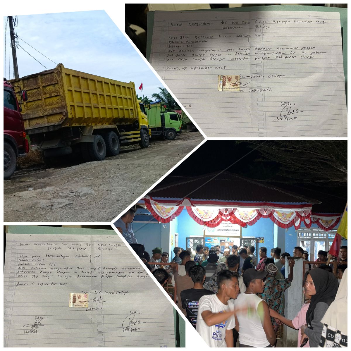 “Karena aksi masyarakat sudah sejauh ini, Tiba-tiba pemerintah Dusun mengundang ninik mamak tokoh masyarakat dan pemuda hendak mediasikan terkait warga dan pihak PT KMP yang tadinya tidak mau menau dan tidak mau ikut campur, namun warga sudah mulai agak geram dan mempertanyakan CSR sekaligus mendesak Rio mundur bersama ketua BPD, atas desakan ini Rio dan ketua BPD bersedia menandatangani surat pengunduran diri dari jabatannya, sebut zami”.