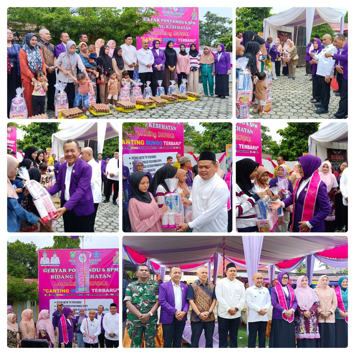 MUARABUNGO,BUNGOPOST.COM – Dinas Kesehatan Kabupaten Bungo menggelar kegiatan Gebyar Posyandu 6 SPM bidang kesehatan sebagai upaya inovasi serta meningkatkan kunjungan pada semua sasaran di posyandu. Adapun agenda kegiatan, yaitu Launching Inovasi Canting Bungo Terbaru (Cegah Stunting Besamo Dampingi Balita Tidak Naik Berat Badan), Simulasi Posyandu 6 SPM. Pengukuhan duta gizi kabupaten Bungo, Penyerahan bantuan ibu hamil KEK dan balita bermasalah gizi, Senam dan kelas ibu hamil Pemeriksaan dokter spesialis anak.